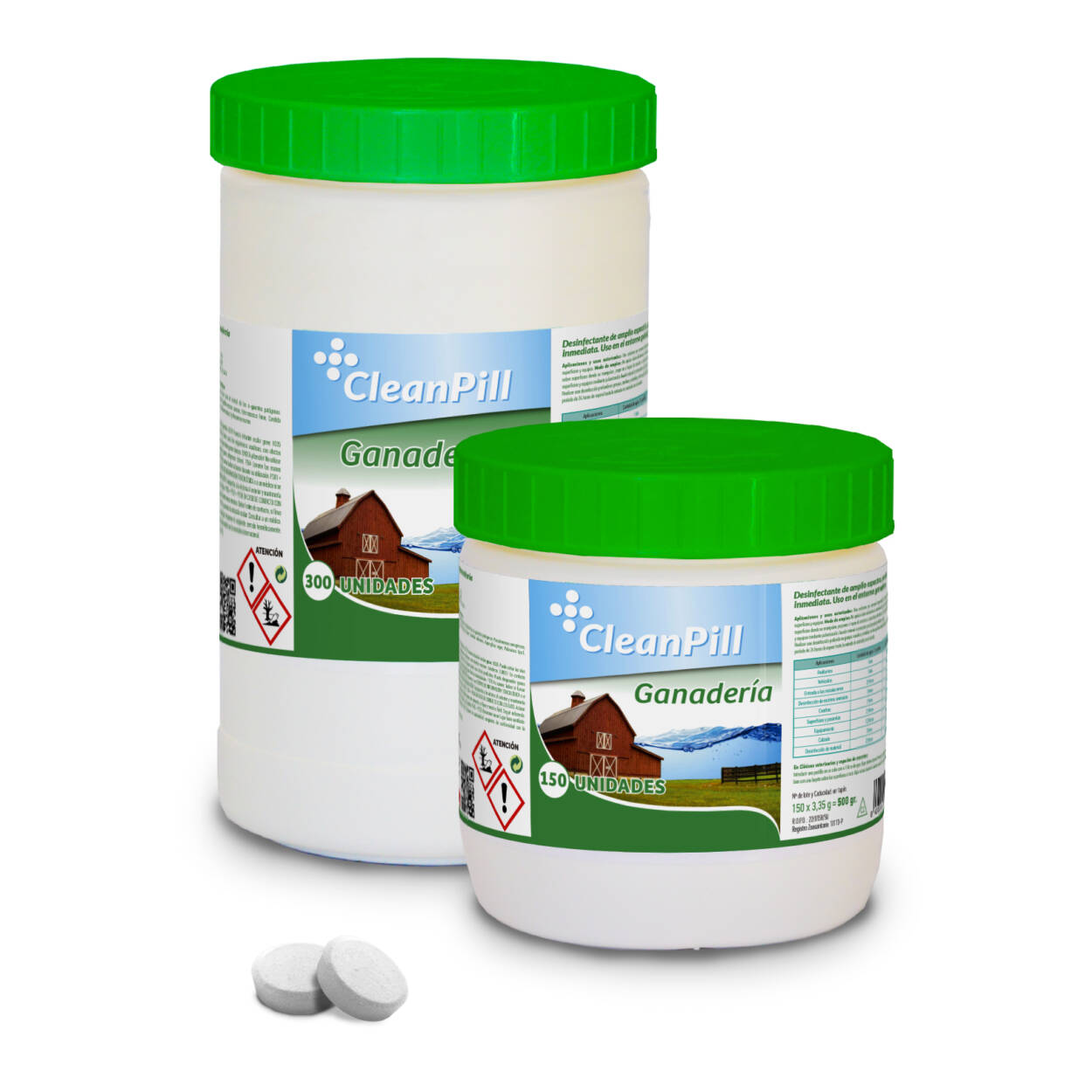 Las pastillas desinfectantes CleanPill® para ganadería están disponibles en diferentes formatos pensados para explotaciones ganaderas, distribuidores y profesionales del sector.